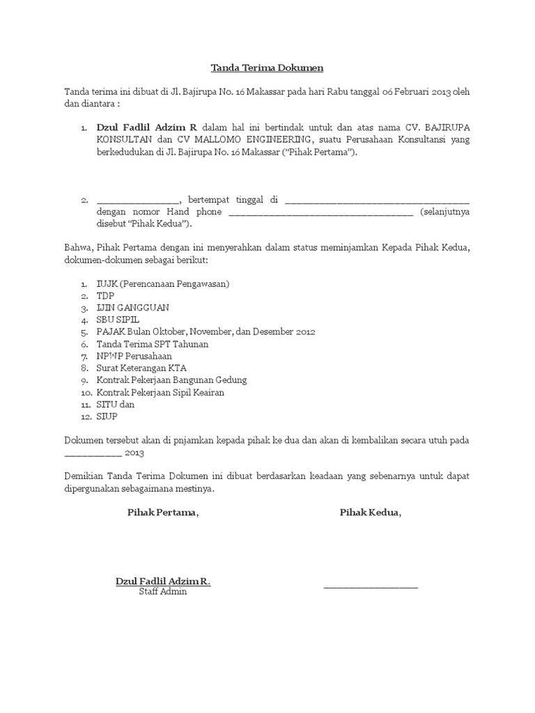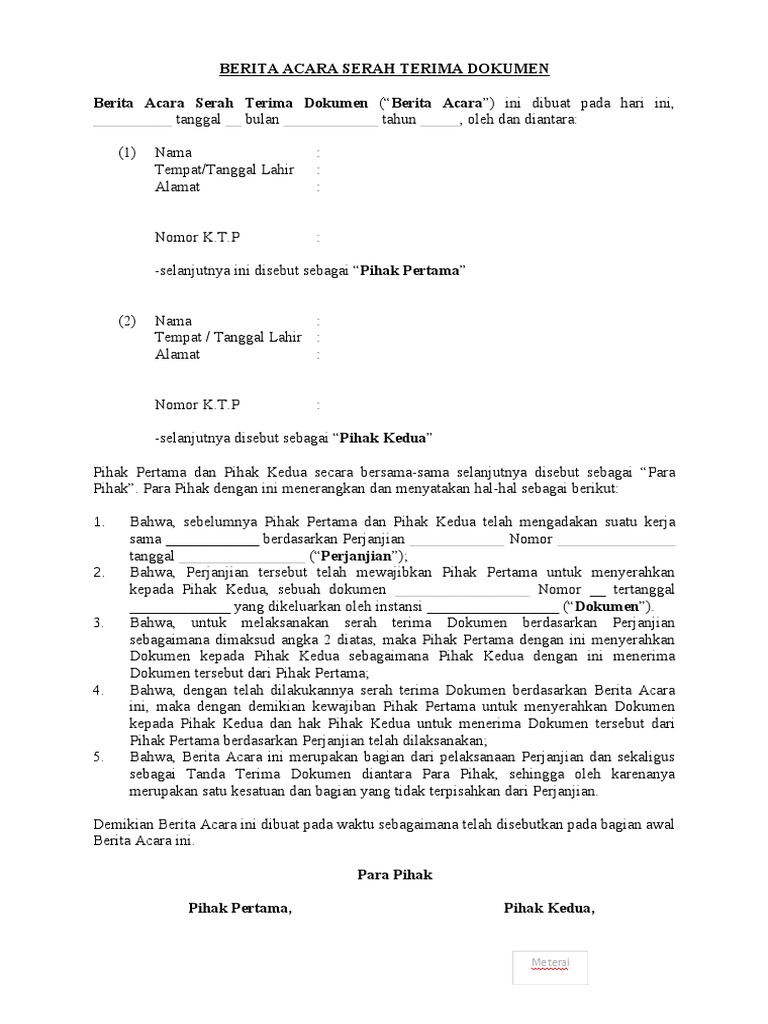 Surat Serah Terima Sertifikat Hak Milik from demo.dokumen.tips Kali ini contoh surat tanda terima uang, barang, dan dokumen akan dijelaskan lebih rinci agar anda dapat membuat surat tanda terima sesuai dengan kebutuhan perusahaan atau kantor anda. Contoh surat tanda terima dokumen jaminan. Bahwa, dalam rangka permohonan registrasi klinik maka pihak kedua dengan ini menyerahkan kepada pihak pertama dan pihak pertama dengan ini menerima dari pihak kedua, dokumendokumen sebagai berikut: June 14, 2020 by nurul saputro. Surat serah terima dokumen perusahaan. Dokumen yang dimaksud juga bukan yang biasa saja, melainkan dokumen penting seperti yang berharga. Dalam pembahasan kali ini, contoh tanda terima dibagi menjadi beberapa jenis berdasarkan barang yang diserah terimakan. Contoh surat tanda terima barang.